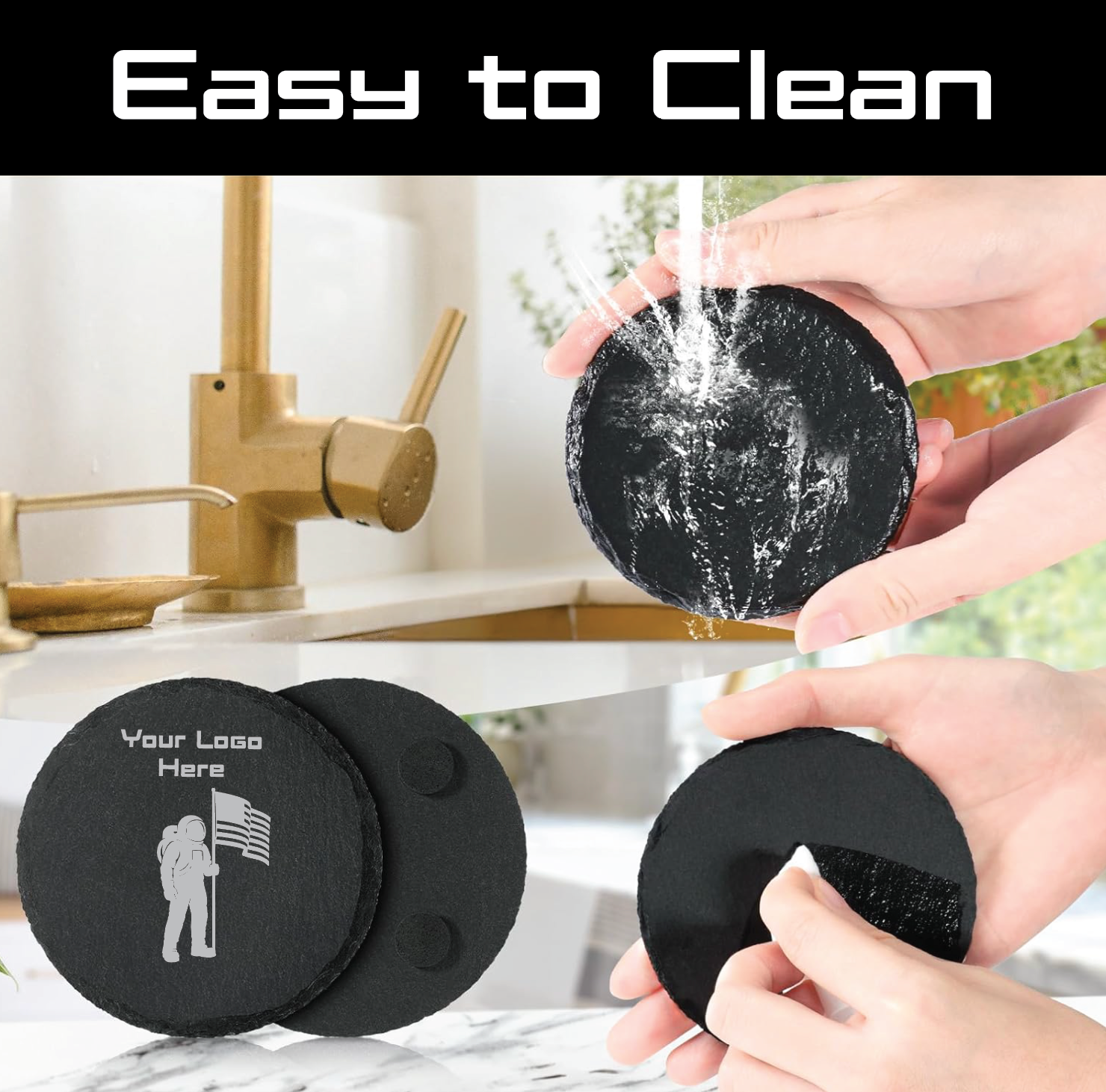Premium 4" round laser-engraved slate coasters built for branding, durability, and clean presentation. Your logo, name, or artwork is permanently engraved into high-quality slate for a sharp, professional finish that never rubs off. Perfect for businesses, offices, restaurants, events, client gifts, and custom home décor. Each coaster is thick, long-lasting, waterproof, and designed to elevate any desk, bar, or conference table
